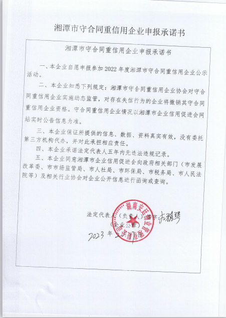 本企業(yè)根據(jù)《湘潭市守合同重信用企業(yè)申報規(guī)定》等編制 2022 年度企業(yè)信用報告書,并保證本報告書內(nèi)容真實、準(zhǔn)確、完整。