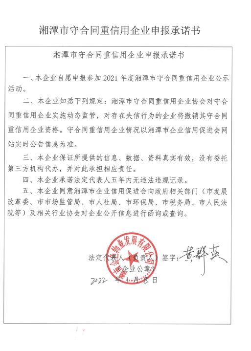 本企業(yè)根據(jù)《湘潭市守合同重信用企業(yè)申報(bào)規(guī)定》等編制 2021 年度企業(yè)信用報(bào)告書,并保證本報(bào)告書內(nèi)容真實(shí)、準(zhǔn)確、完整。