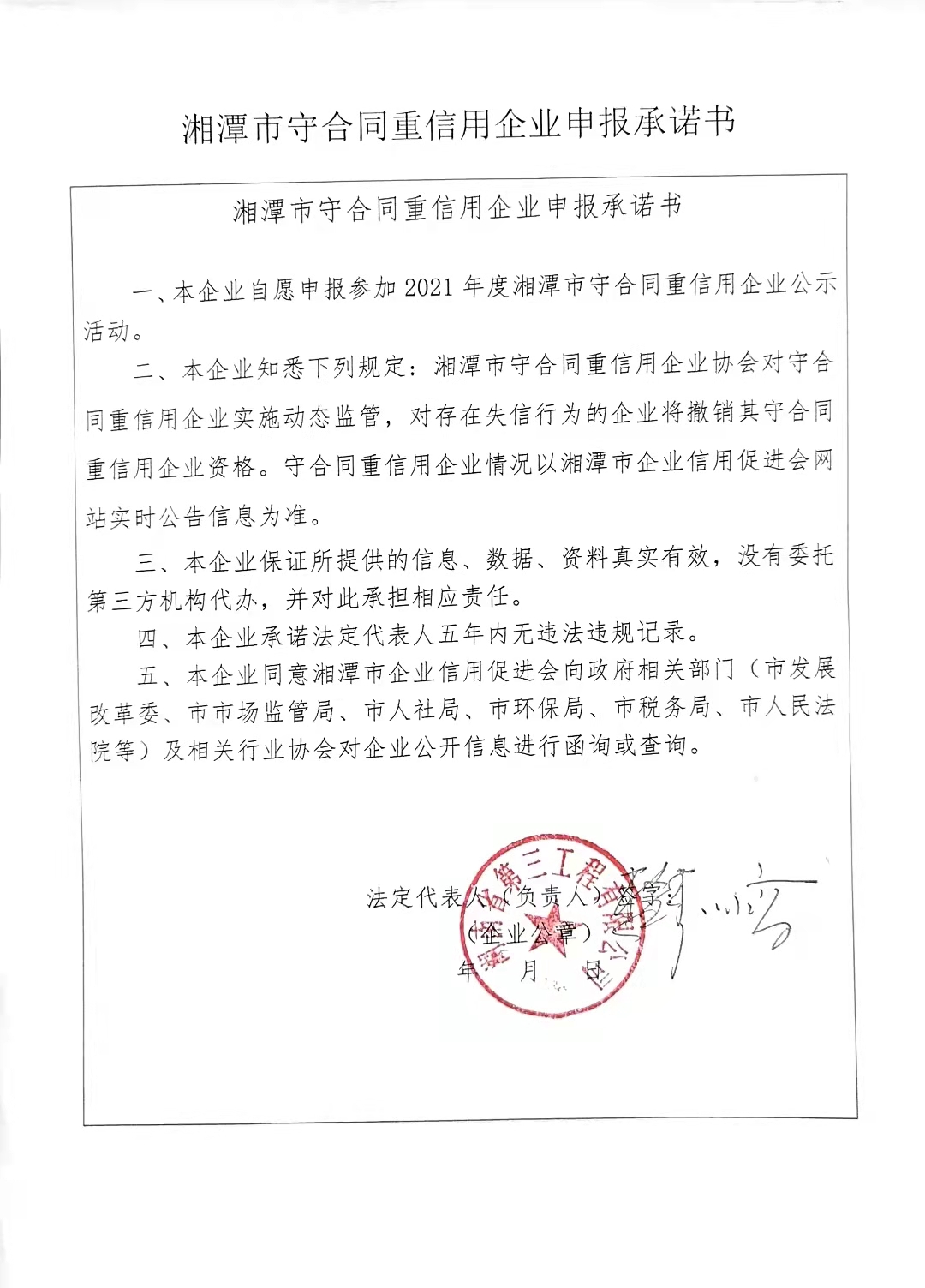本企業(yè)根據《湘潭市守合同重信用企業(yè)申報規(guī)定》等編制 2021 年度企業(yè)信用報告書,并保證本報告書內容真實、準確、完整。