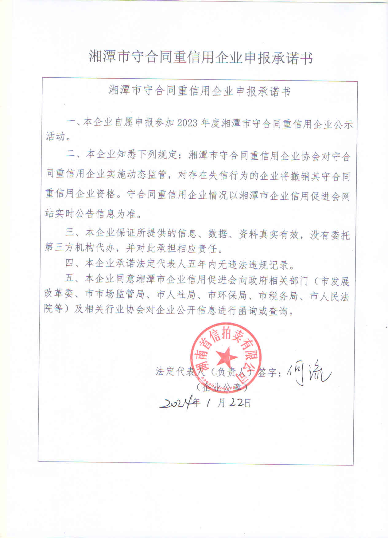 本企業(yè)根據(jù)《湘潭市守合同重信用企業(yè)申報規(guī)定》等編制 2023 年度企業(yè)信用報告書,并保證本報告書內(nèi)容真實、準確、完整。