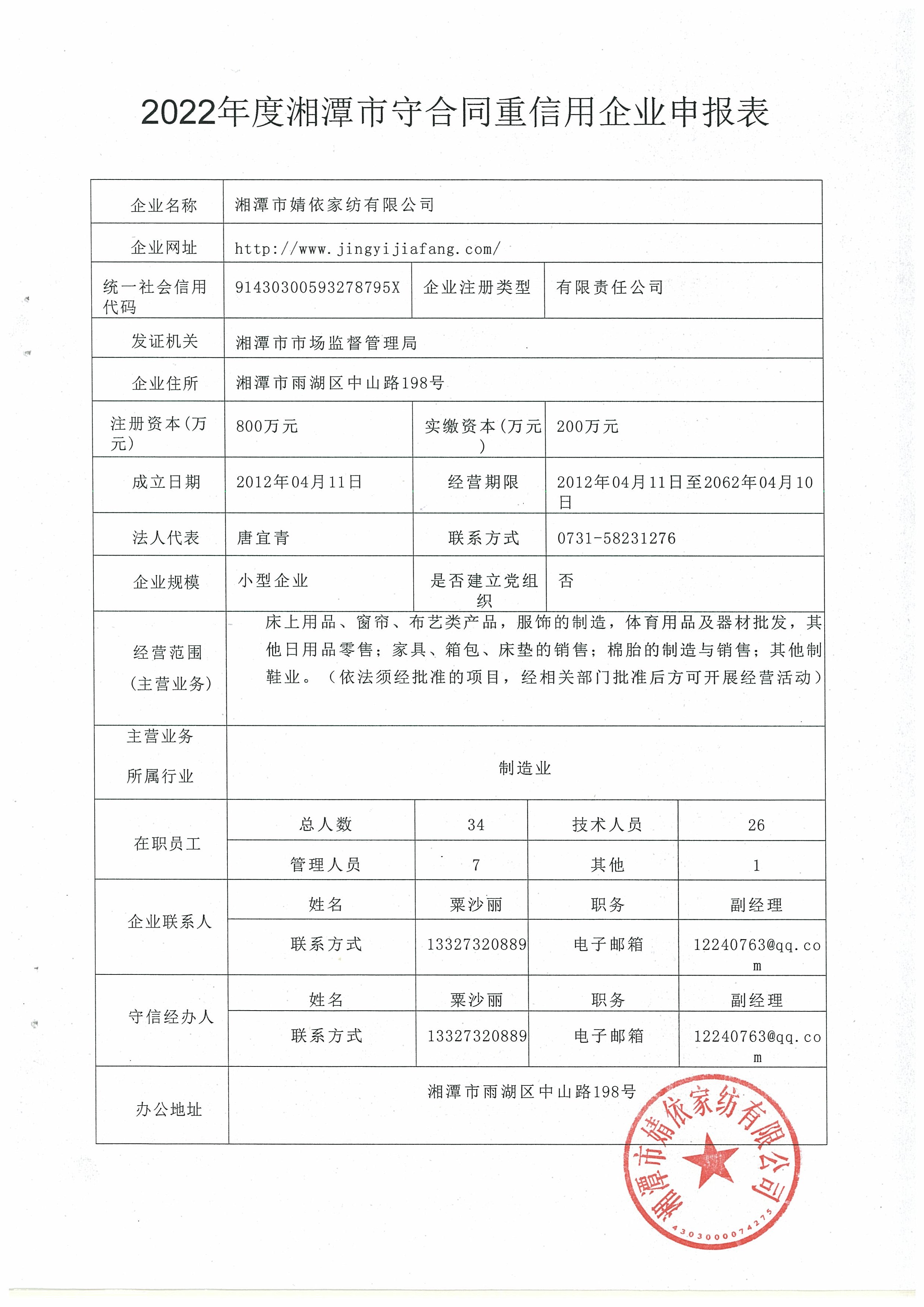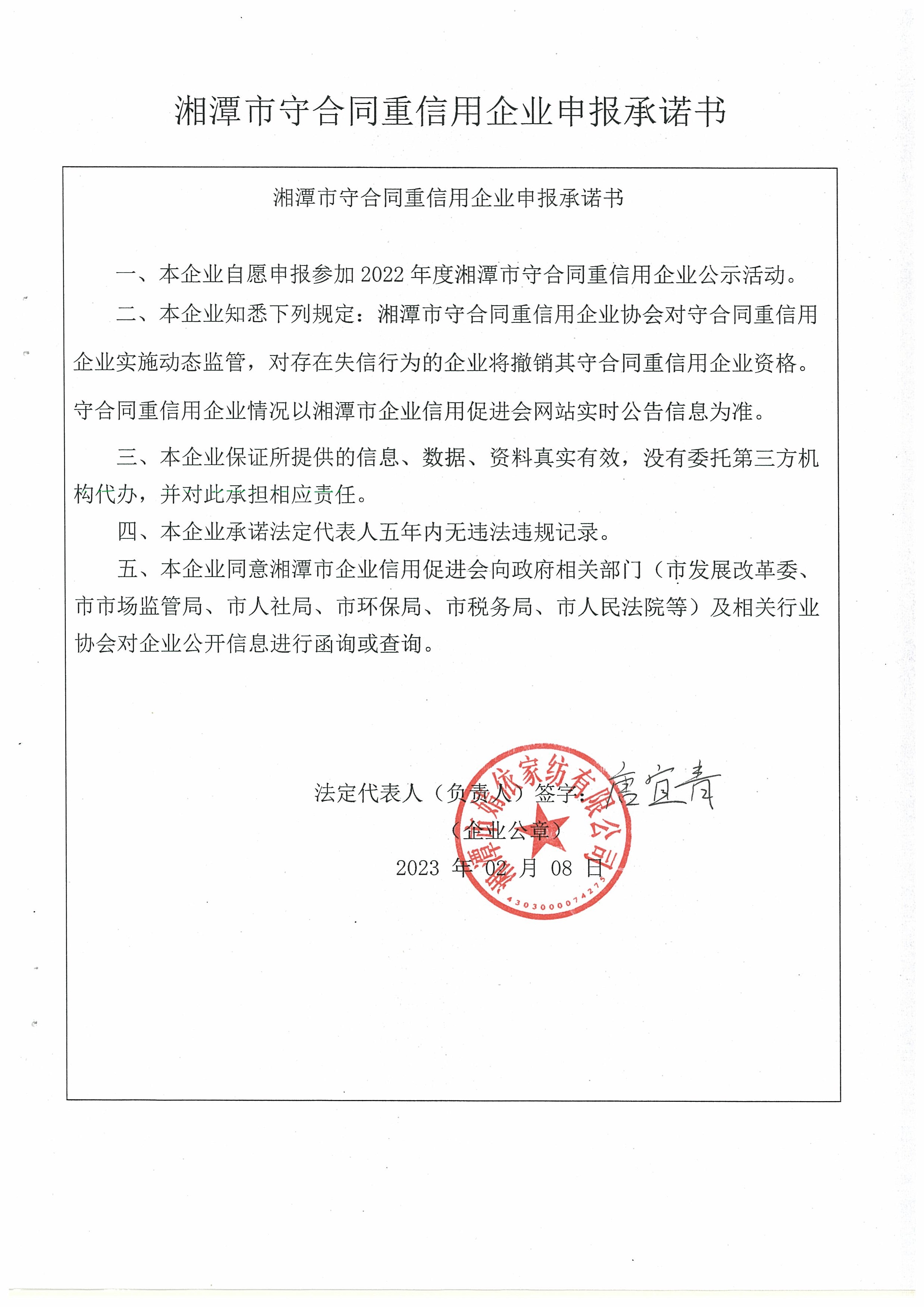 本企業(yè)根據(jù)《湘潭市守合同重信用企業(yè)申報(bào)規(guī)定》等編制 2022 年度企業(yè)信用報(bào)告書,并保證本報(bào)告書內(nèi)容真實(shí)、準(zhǔn)確、完整。