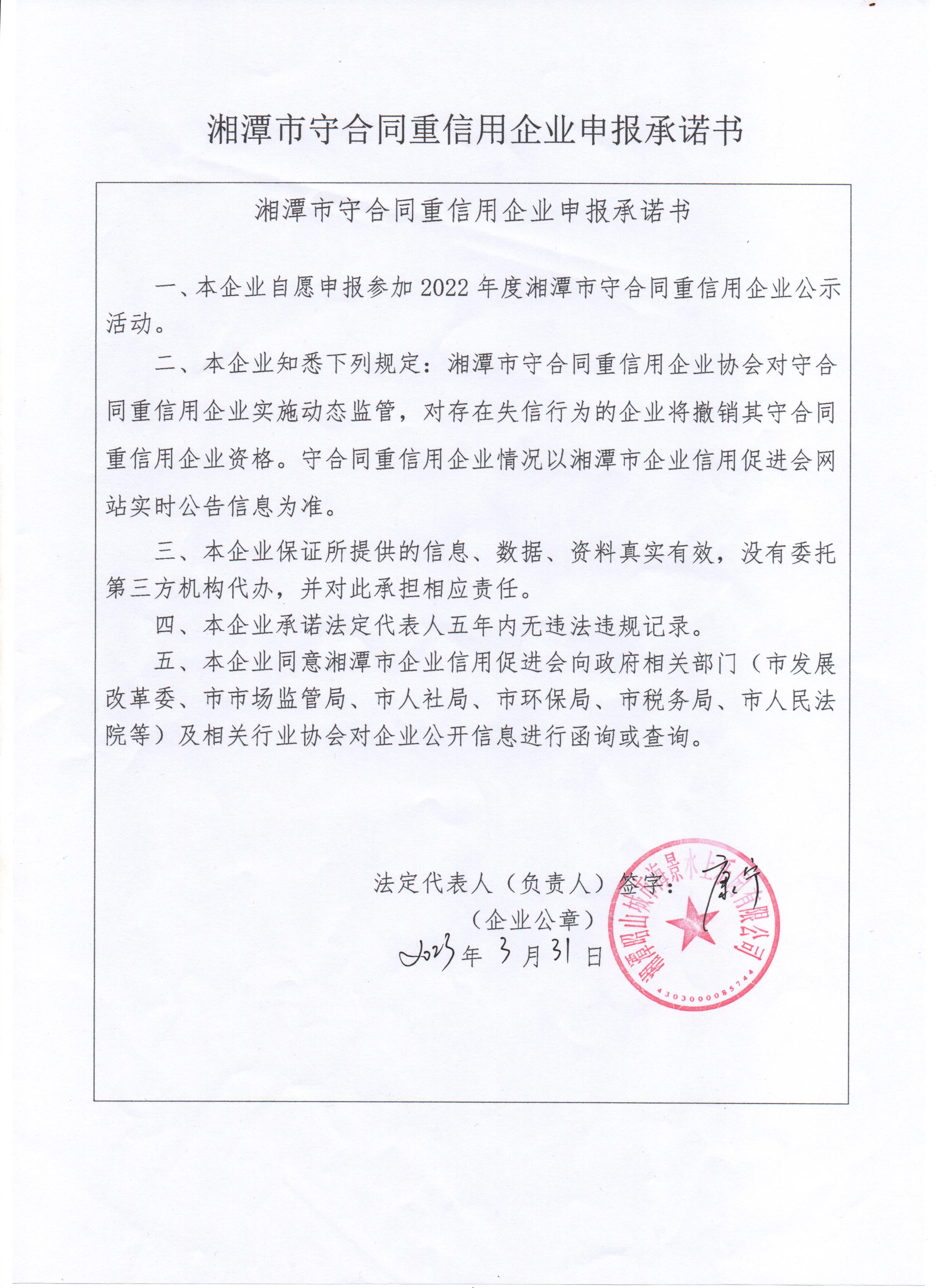 本企業(yè)根據(jù)《湘潭市守合同重信用企業(yè)申報規(guī)定》等編制 2022 年度企業(yè)信用報告書,并保證本報告書內(nèi)容真實、準確、完整。